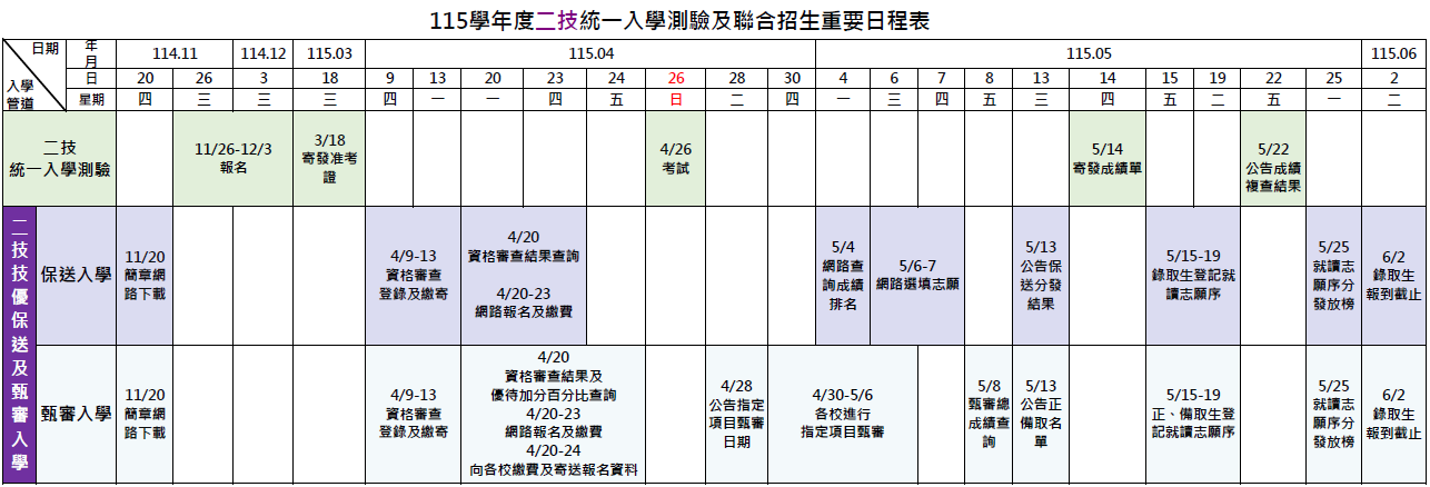 115學年度二技統一入學測驗及二技技優甄審招生重要日程表公告